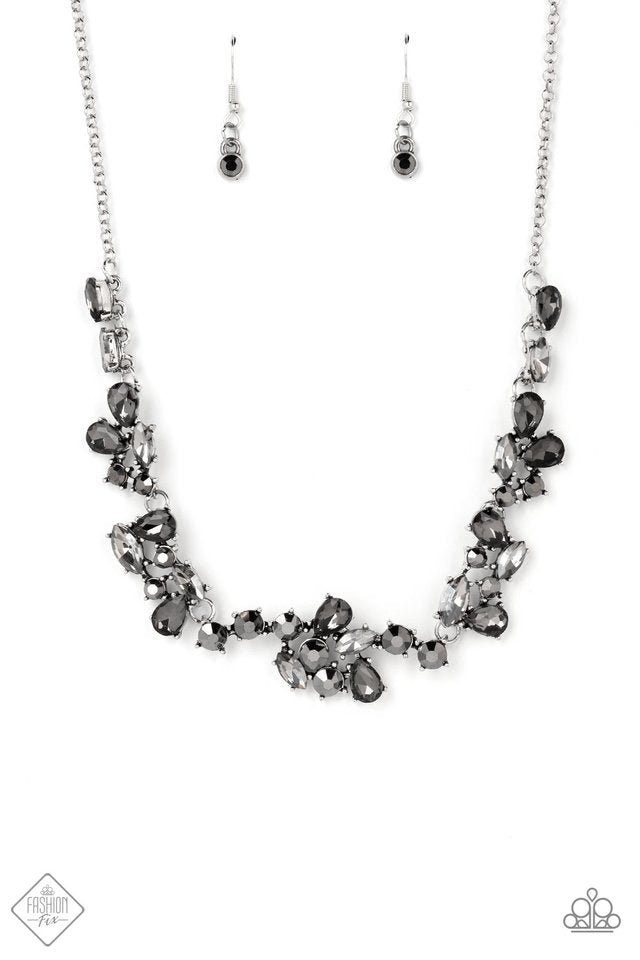 Smoky gems and polished hematite in a variety of inspired shapes gather together into scattered clusters that connect across the collar. The edgy teardrop, marquise, and round shapes attach to a dainty silver chain, creating a fragmented masterpiece. Features an adjustable clasp closure.